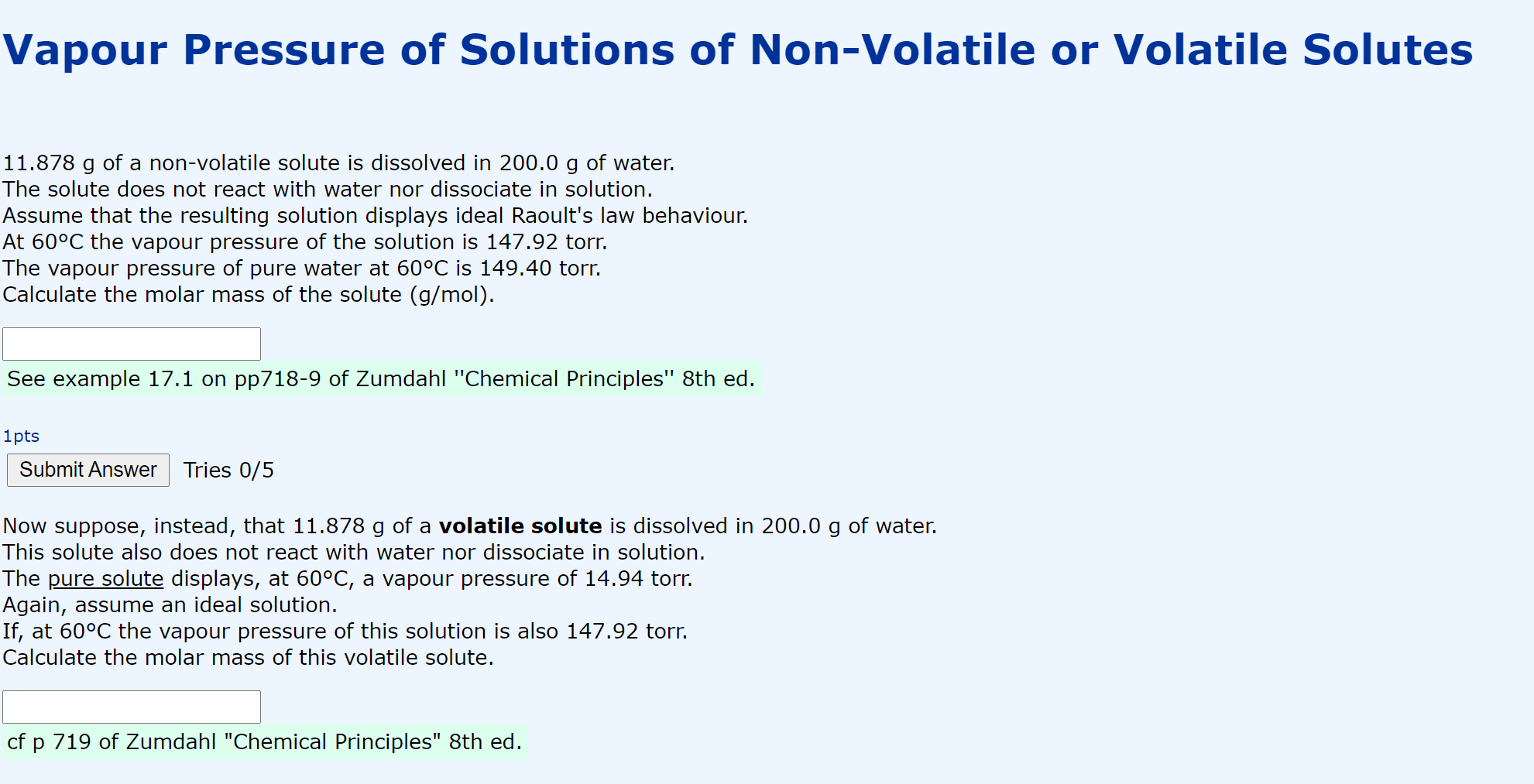 Nonvolatile and volatile solutes 16 of 20 > review constants periodic table as the concentration of a solution increases its vapor pressure decreases. P solution = (p solv o) (χ solv) The key equation to use is raoult's law, but in a slightly expanded form from how it is first presented: Raoult's law there are several ways of stating raoult's law, and you tend to use slightly different versions depending on the situation you are talking about. According to raoult's law, for dilute solutions containing non volatile solute, the relative lowering of vapor pressure, δp/p o is equal to the mole fraction of solute, x 2. Calculate the vapor pressure of a solution made by dissolving 60 g of sodium chloride (nacl) in 400 g of water (h 2 o). For a nonvolatile solute bin a liquid solvent a, the relationship between concentration and vapor pressure is expressed by raoult's law: For a binary mixture of two volatile component a and b with mole fraction xa and xb with pure component vapour pressure respectively. Raoult's law definition the pressure at which vapor is formed above a solid or liquid at a particular temperature is called the vapor pressure. Therefore, the vapor pressure of the solution will be the vapor pressure due to solvent only. It states that in an ideal solution the partial vapour pressure of each volatile constituent is equal to the vapour pressures of pure constituent at that temperature multiplied by its mole fraction in the solution. Unable to watch the video, please try another server. Phases of matter study cards;